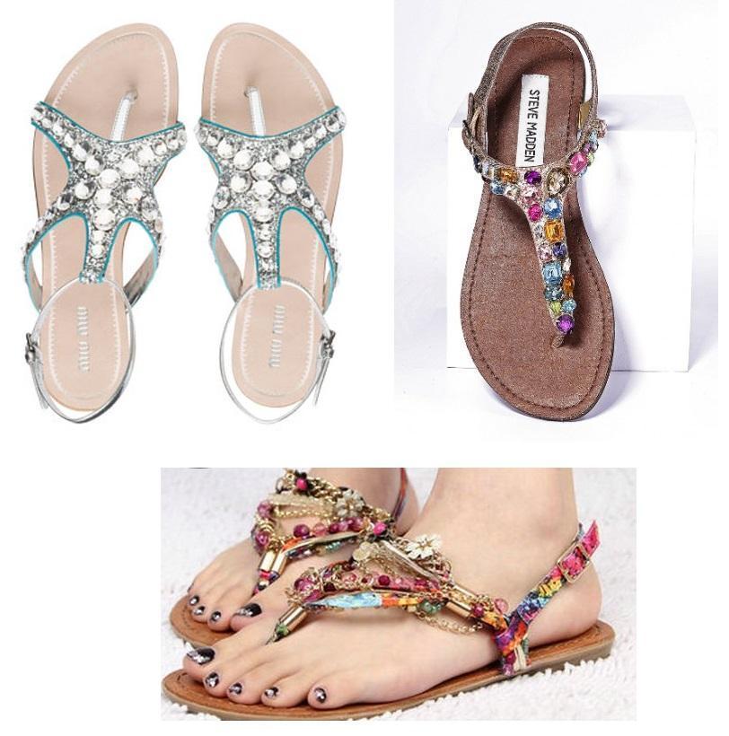 Na hora de escolher sandálias para o verão, sejam rasteirinhas ou com um pouco de salto, a sua melhor opção são aquelas que tenham tiras, pedraria ou miçangas na zona do peito do pé. Com elas, você conseguirá desviar a atenção para esta parte do pé e a largura dos tornozelos será disfarçada perfeitamente. Assim, prefira as sandálias com tiras um pouco largas ao invés de muito finas.