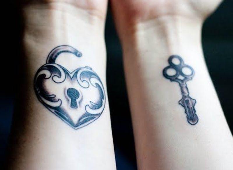 Se não gostar da opção anterior, outro bom exemplo das melhores tatuagens para casais é esta outra na qual também se usa o símbolo do coração como sinal do amor. Mas, neste caso, faz-se referência a que seu coração só tem uma chave e, por isso, a outra pessoa do casal terá que tatuar essa chave com a qual conseguiu abrir seu coração.