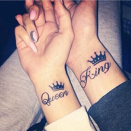 Você pode brincar com diferentes ideias como, por exemplo, que o garoto tatue a coroa típica dos reis e a garota a das rainhas ou, se preferir, pode apenas indicar embaixo a palavra "Queen" e "King" para especificar o gênero.