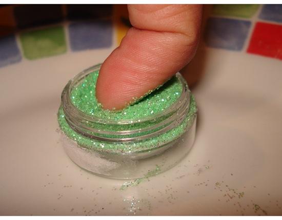 Enfie então o dedo com a unha molhada de esmalte no potinho de glitter. Não precisa fazer força.