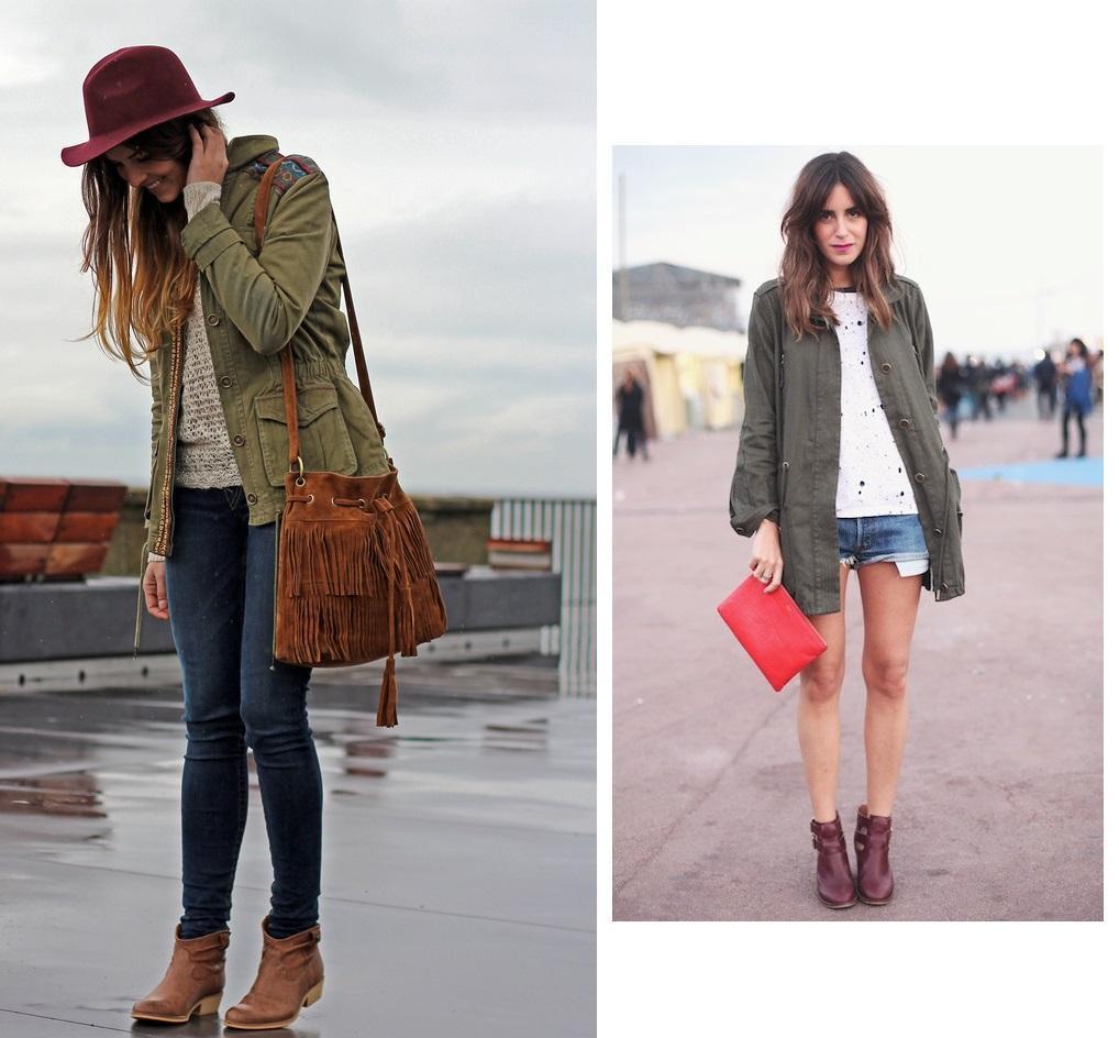 Nas últimas temporadas vimos que a cor verde militar está muito na moda, e se tiver umas botas marrom, é a ocasião perfeita para tirar partido desta tonalidade. Consiga um look militar autêntico combinando uma parca ou jaqueta verde caqui com jeans, longos ou curtos, e uma camisa ou camiseta branca.