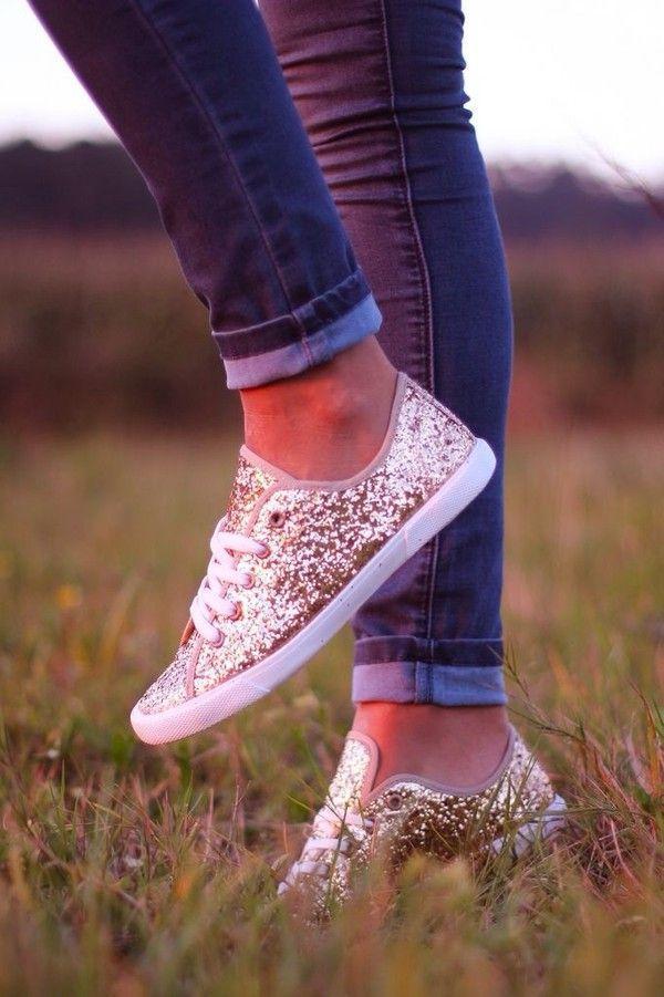 Se deseja apostar nos sapatos dourados porque são tendência, mas não se sente muito confortável com os looks mais finos, não desespere. Os sapatos dourados também valem para os looks mais informais. Use sapatilhas douradas e coloque um par de jeans.