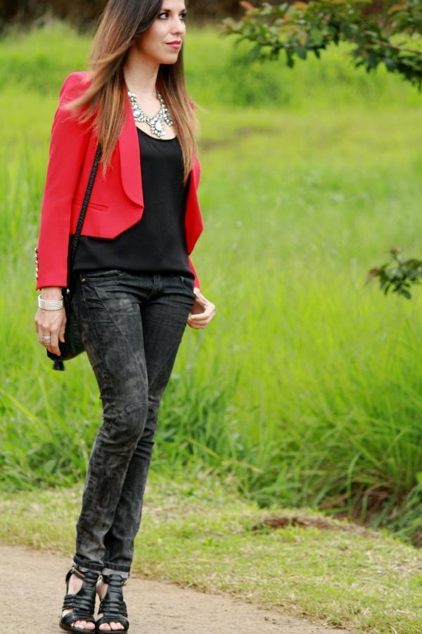 Um look ideal para ir a uma festa ou vestir durante a noite é o que se obtém ao combinar um blazer vermelho com alguma peça preta, seja uma calça ou um vestido. Usar um total look preto e colocar um blazer vermelho faz com que seu estilo fique sofisticado e feminino, perfeito para arrasar onde você for.