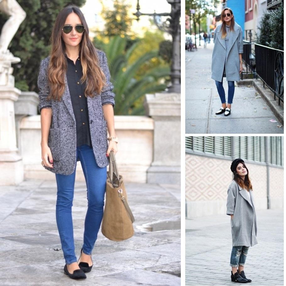 Se você se sente mais cômoda com looks urbanos e seu guarda-roupa está repleto de diferentes modelos de jeans, você é uma pessoa de sorte! Eles combinam muito bem com um casaco cinza. Podem ser skinny, boca-de-sino, desgastados, com buracos, claros, escuros... são uma ótima opção para as suas atividades do dia a dia pela cidade. Complete seu outfit com um mocassim para um estilo mais british ou sapatinho planos ou com salto para ficar maravilhosa.