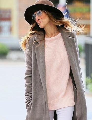 Você prefere um look romântico? Então, nada melhor do que combinar seu casaco cinza com uma blusa ou camiseta rosa claro. Este tom é uma das cores que estão na moda e é ideal para dar um toque doce e fresco a qualquer outfit de inverno. Acrescente ao look uma calça em tom cinza mais claro que o do seu casaco e alguns acessórios de prata como um colar comprido e algumas pulseiras para estar tão espetacular como a Sarah Jessica Parker na foto.