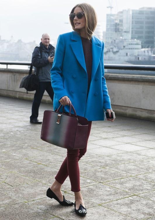 Se você ama moda e é seguidora das últimas tendências, esta combinação é perfeita para você. Olivia Palermo, como vemos na imagem, está espetacular com um sobretudo azul e peças em bordô, a cor por excelência da estação. Use com calças justas e uma bolsa grande bordô, complete o look com sandálias pretas e estará ideal assim como a it girl do momento.