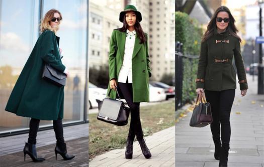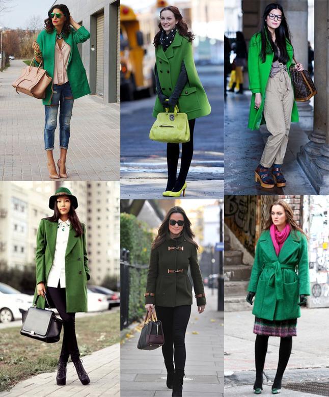 O segredo está em juntar blocos de cores lisas e da mesma intensidade, por isso, se o seu sobretudo é de um verde potente, também deverá ser a cor que escolher para combinar.