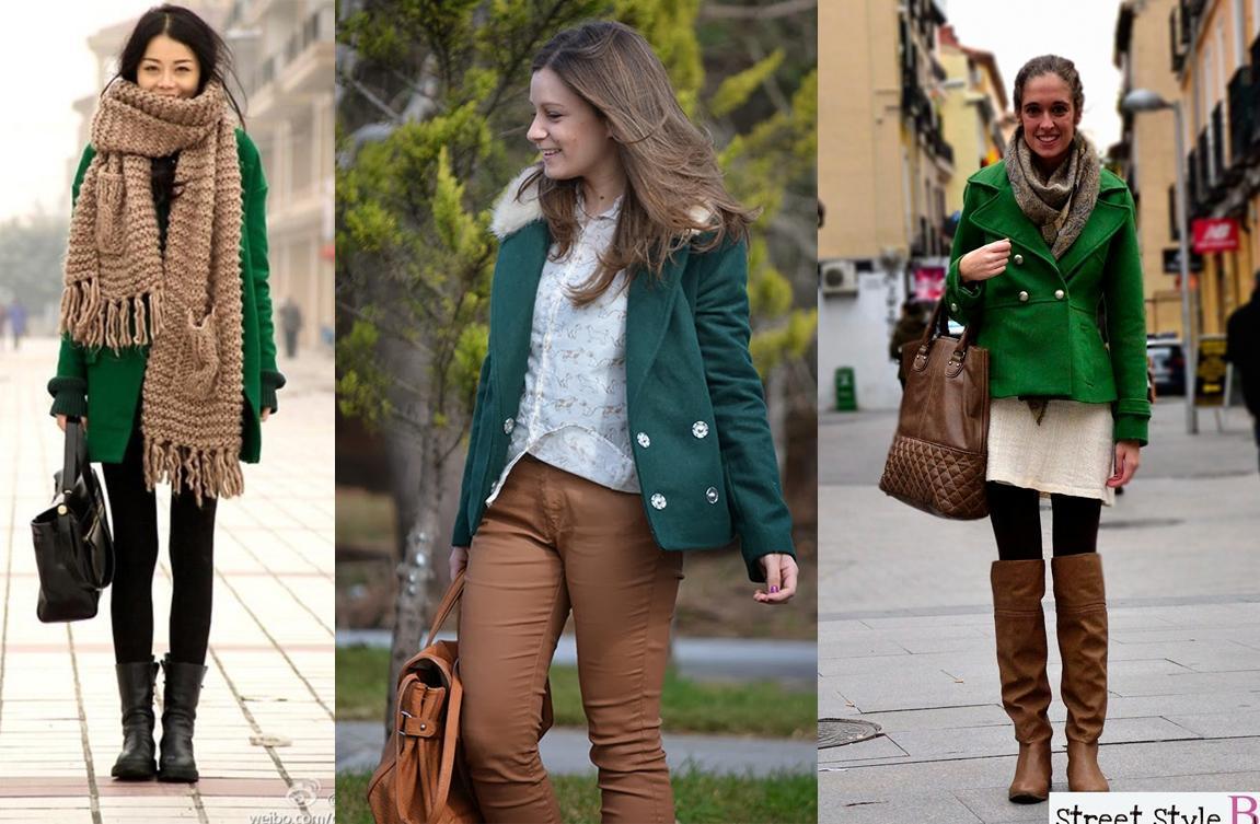 Também é muito comum que na hora de combinar um sobretudo verde opte pelos tons marrons: bege, café, camel, chocolate, etc. Poderá escolher calças de qualquer tom marrom ou jogar com o resto dos acessórios como os sapatos, bolsas, cachecóis ou lenços.