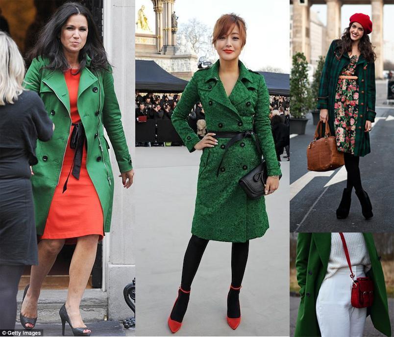 Para as moças que querem ir um pouco mais além, uma alternativa provocadora, mas também muito comum, é vestir o sobretudo verde com alguma peça de cor vermelha. Não se trata de combinar o sobretudo com peças como calças ou leggings, a não ser que queira parecer uma árvore de Natal, mas deverá ser algo bem mais sutil.