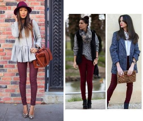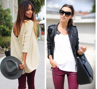 Se você for uma apaixonada pela moda e gostar de seguir as últimas tendências, esta combinação é ideal para você. Faça como Olivia Palermo e exiba sua calça bordô com um casaco de corte reto em azul e uma superbolsa também em grená. E se você achar uma aposta arriscada demais, também pode usá-la com um blazer azul marinho e uns sapatinho pretos de salto para conseguir um outfit mais sofisticado.