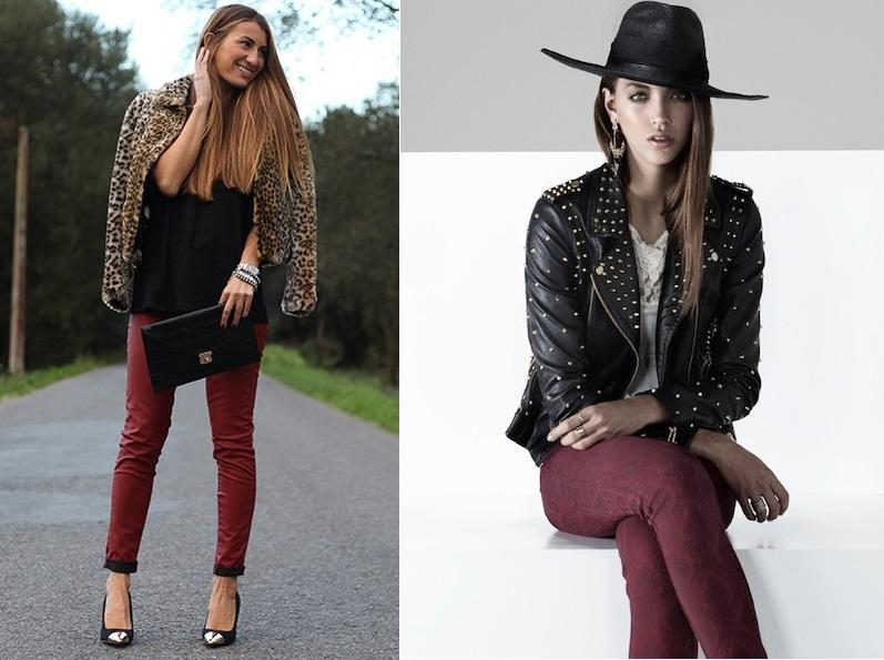 E para um look doce e romântico, a combinação bordô-nude é ideal. Além disso, as peças em tons de bege ou nude permitirão a você dar maior protagonismo à sua calça, e para dar um toque chique em seu vestuário, propomos incluir algum complemento dourado, como, por exemplo, um cinto e umas pulseiras.