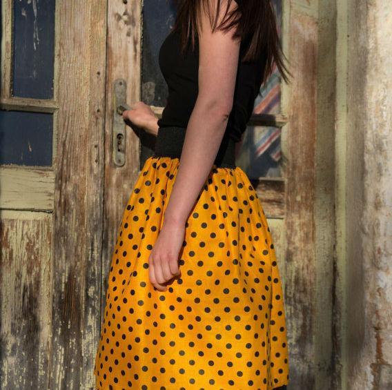 As saias de bolinhas também são perfeitas para criar um look retro. Escolha as que tem caimento (as de tecidos mais leves são perfeitas para isso) e prefira as mais compridas. Escolha tons pastéis e camisetas de babado e renda, combinando com sapatos de ponta arrendondada.
