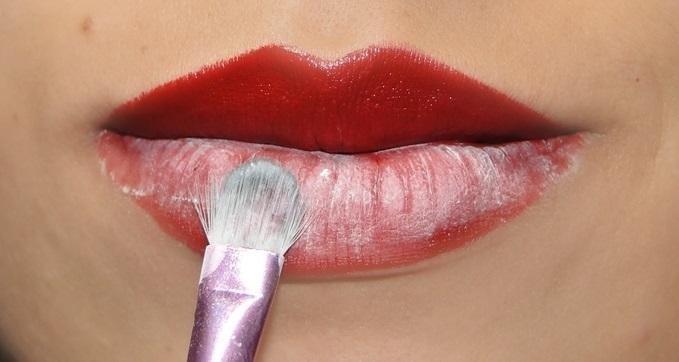Depois de aplicar o pó translúcido por toda a boca, os seus lábios vão ficar brancos, isso é normal não desespere. Com o mesmo pincel que aplicou o pó, passe sobre toda a superfície dos lábios até que o branco saia por completo. No final, o resultado é um acabamento matte e super aveludado.