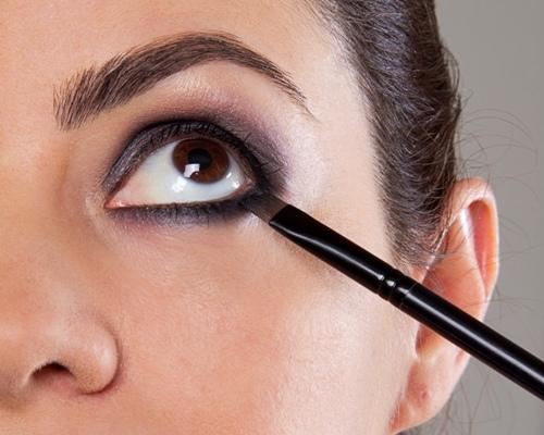 Não se esqueça de aplicar lápis preto na linha interna dos cílios e aplique também uma sombra escura rente à linha dos cílios.