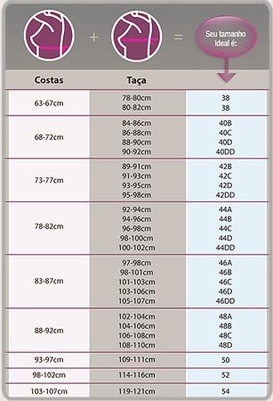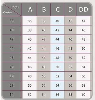 Os tamanhos A, B, C, D e DD correspondem ao tamanho das taças. Para utilizar esta tabela deverá medir também o tamanho das costas e taças. Entenda o significado de cada letra: