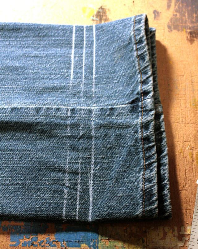 Alinhe as marcas e coloque uma perna da calça jeans por cima da outra. Coloque a régua deixando a marca de giz do lado direito da régua.