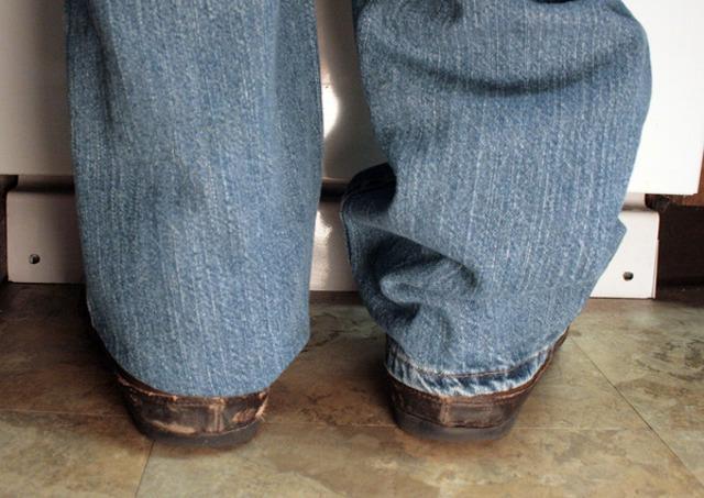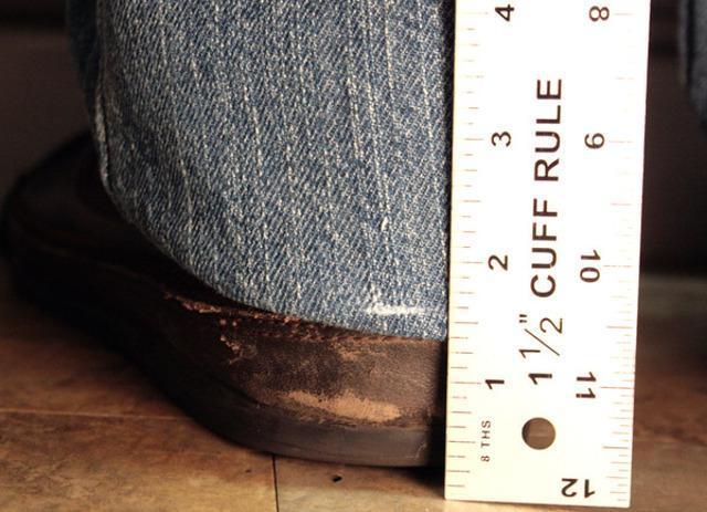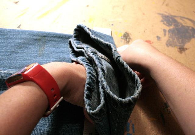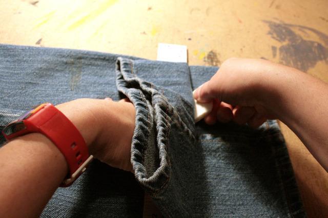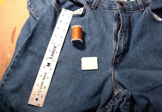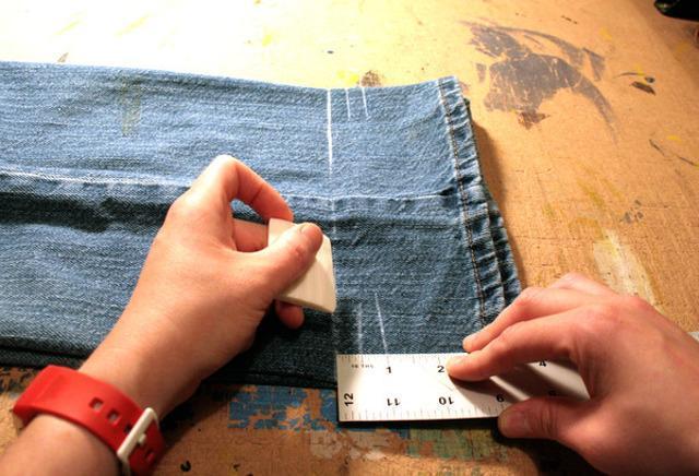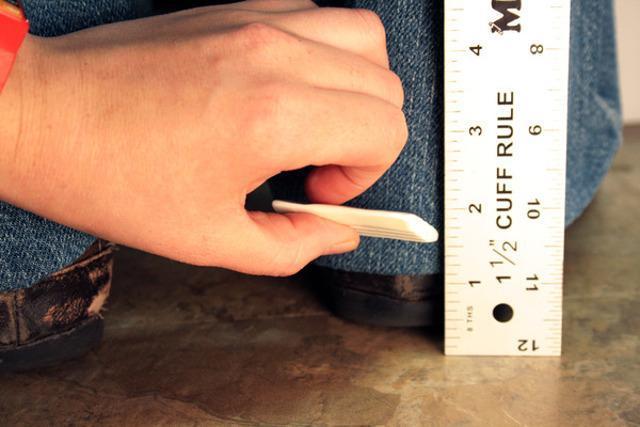Marque a parte posterior do tecido da calças jeans usando o giz. Utilize a régua e meça a altura desde o chão até onde fez a marca.