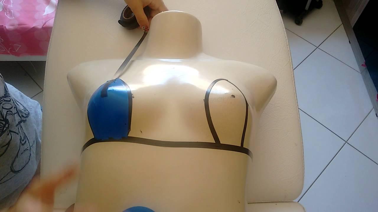 - Então, passe a fita que simula a cordinha que amarra nas costas na altura abaixo dos seios.