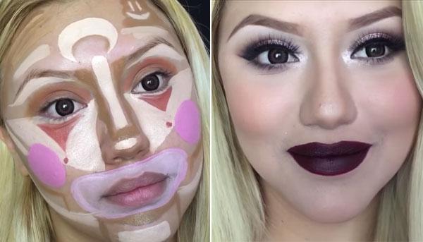 Uma técnica que ficou bastante famosa recentemente foi o clown contouring, que traduzido para português significa contorno de palhaço. O clown contouring é nem mais nem menos que uma técnica de contorno do rosto que utiliza cor, para além do iluminador e contorno utilizados no contorno facial habitual. No início você fica parecendo um palhaço, mas no final de tudo esfumado o resultado é lindo. O processo do contorno de palhaço consiste na aplicação de diferentes cores de produtos específicos em pontos específicos do seu rosto, que você quer valorizar e definir ou esconder.