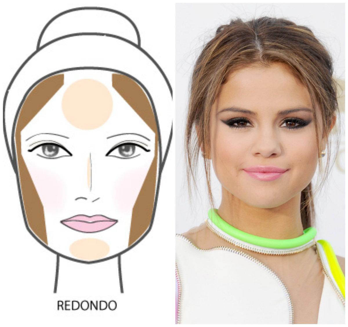 Para rostos redondos, o que se pretende com o contorno facial é conseguir dar a sensação de altura ao rosto, de forma a parecer mais comprido e menos gordo. Para isso, você deve escurecer toda a parte lateral do rosto com contorno e iluminar a parte central, queixo, nariz e testa.
