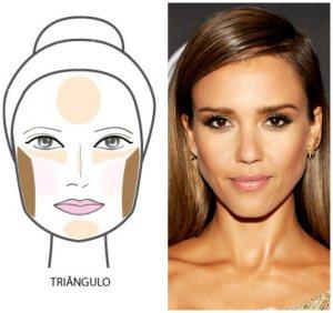 Os rostos triangulares são aqueles que apresentam uma parte de baixo do rosto mais larga que a parte de cima. Neste tipo de rosto o que se pretende é esconder esta caraterística mais larga da parte de baixo e colocar em evidência a parte de cima. Então o que devemos fazer é aplicar contorno nas laterais do rosto e iluminar a parte central do rosto, queixo, nariz e também abaixo dos olhos.
