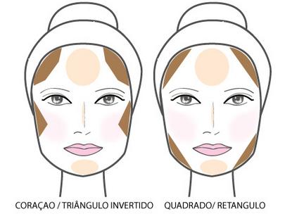 Sendo assim, imagine que você quer dar uma afinada no nariz, basta aplicar contorno nas laterais do nariz. Pelo contrário, para destacar o nariz você deve aplicar iluminador na cana do nariz. Se tem a testa muito grande e quer diminuir, terá de aplicar contorno na parte superior da testa. Para afinar as bochechas, o truque é aplicar contorno abaixo das têmporas. E para aumentar, basta aplicar iluminador e blush nas maçãs do rosto. Se você aplicar iluminador abaixo do arco da sobrancelha estará a levantá-las. E se você quiser dar destaque aos lábios, deve aplicar corretivo em volta deles e depois iluminador no "V" do lábio superior.