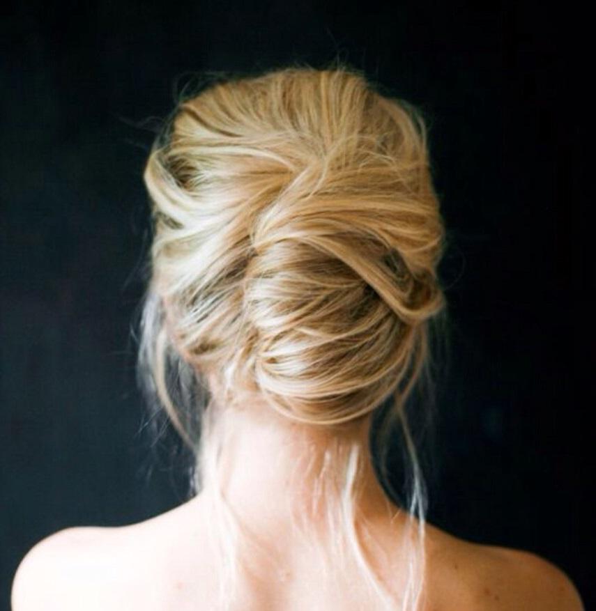 Segure esse alça com uma mão. Com a outra, enrole o resto do cabelo sem apertar, fazendo o coque. Esconda as pontas dos fios dentro do coque.