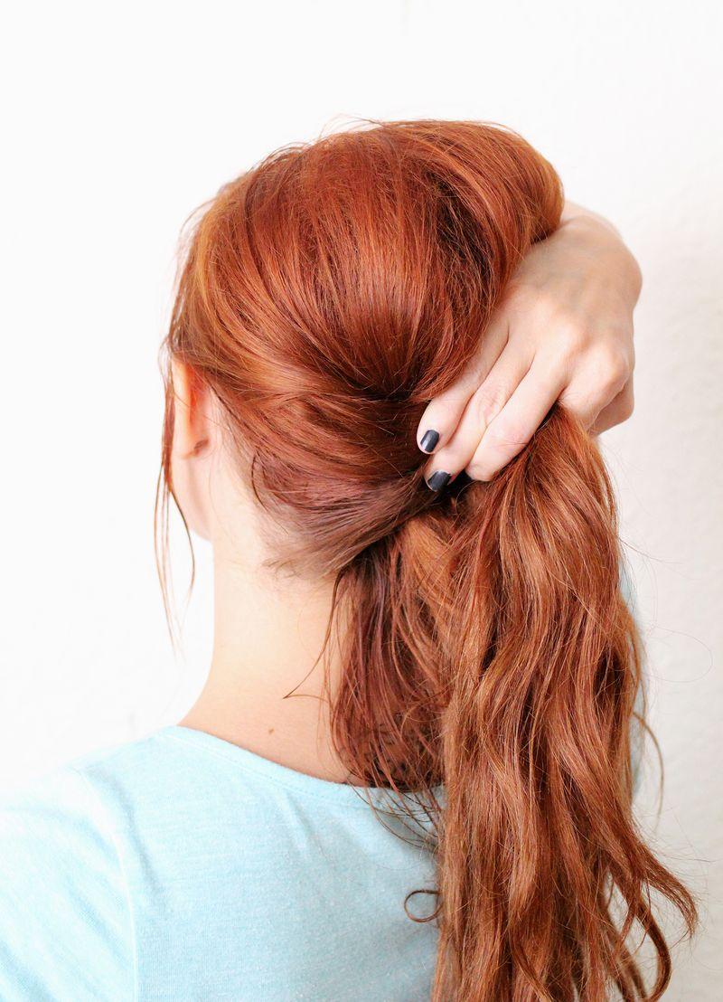 Faça um rabo de cavalo no centro da nuca, mas não prenda com elástico. Segure-o com a mão. Enrole o rabo de cavalo com a mão, criando uma alça vertical.