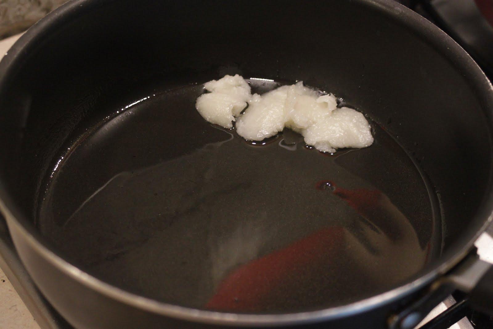 Coloque o óleo de coco e a manteiga de karité dentro da panela e aqueça por alguns minutos em fogo baixo, mexendo sempre para misturar bem. Quando o conteúdo da panela ficar fundido homogêneo, retire a panela do fogo.