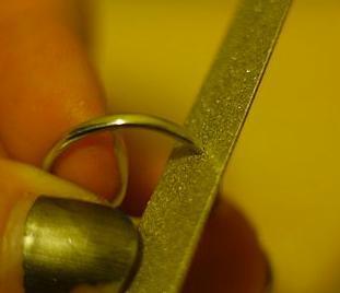 Corte o anel com um alicate. Muito lentamente abra o anel; você pode fazê-lo com os dedos, senão, use uma pinça. Quando estiver um pouco aberto, lixe os extremos para fazer perder o tamanho do anel que sobra. Lixe muito bem o anel, deve ficar muito suave.