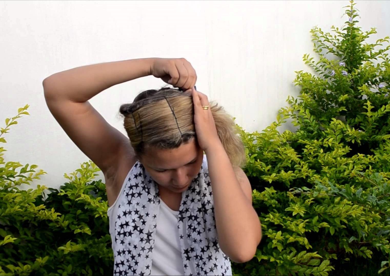 Faça uma divisória na lateral direita da cabeça. Penteie uma mecha da direita para a esquerda, contornando a cabeça totalmente, e prenda a ponta com um grampo. Vá repetindo essa etapa até todo o cabelo estar preso em redor da cabeça. Não se esqueça de ir firmando os cabelos com as mãos para que não se soltem.