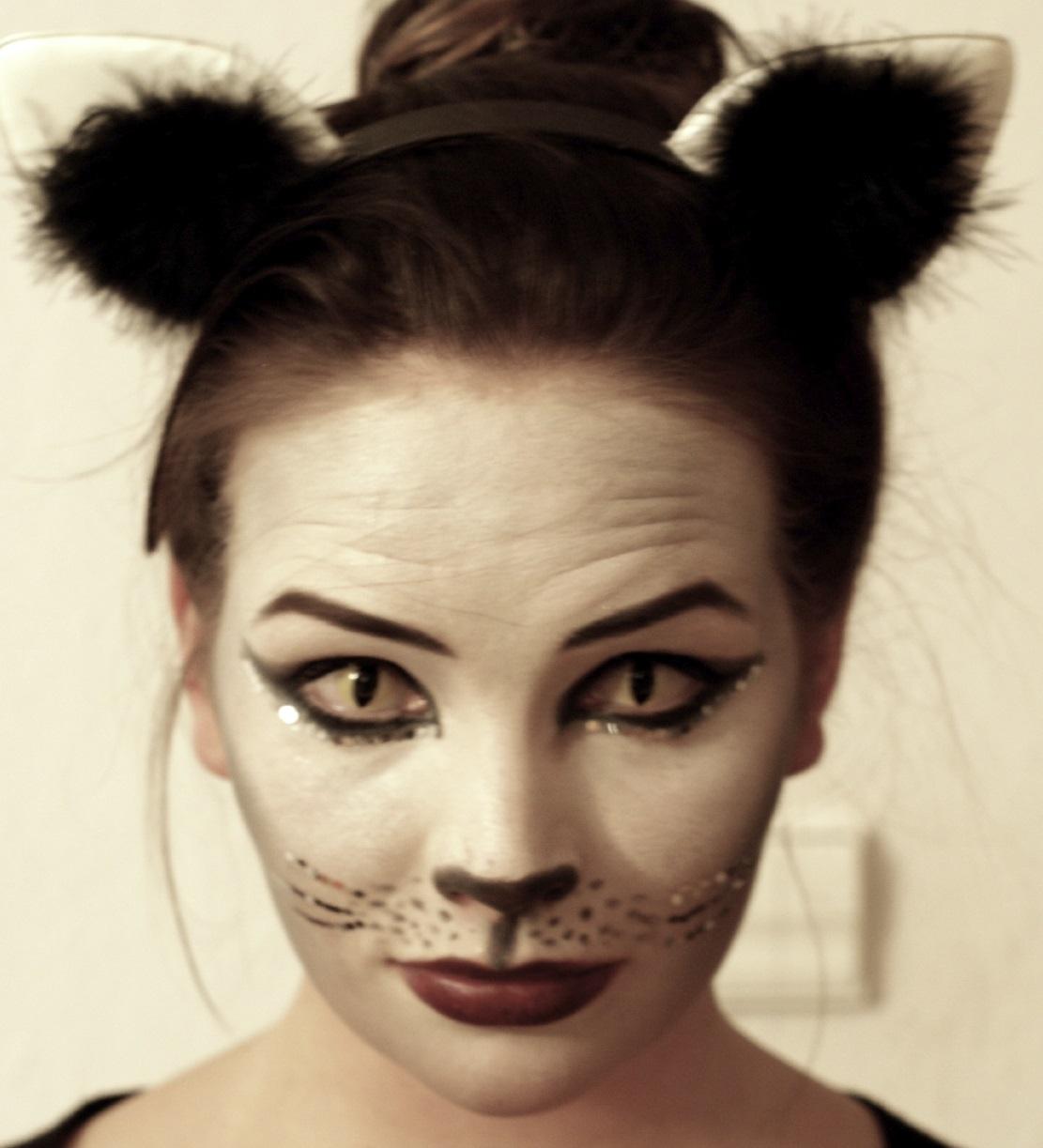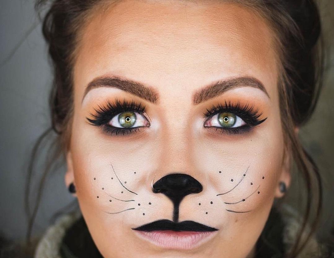 Em seguida, é hora de aplicar a sombra de olhos. Comece por fazer um olho esfumado com sombras castanha, preta e/ou cinza, sem esquecer a zona dos cílios inferiores. O olho da maquiagem de gatinho deve ser bem intenso. Logo, faça o delineado gatinho (óbvio!), criando uma linha mais longa do que o normal na direção do interior do olho. Preencha as sobrancelhas e aplique uma sombra ou lápis branco na osso para iluminar o olhar, como na fotografia. Finalize os olhos com cílios postiços ou duas camadas de máscara de cílios.
