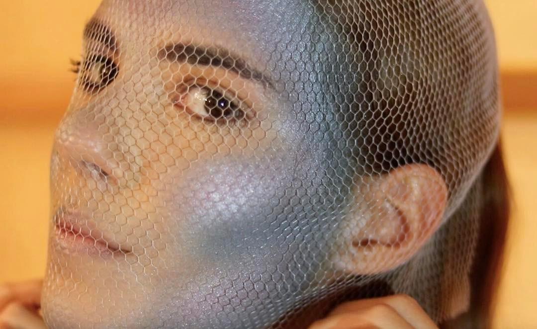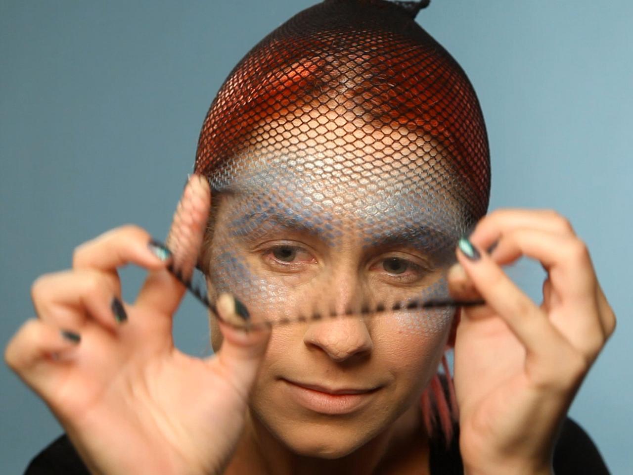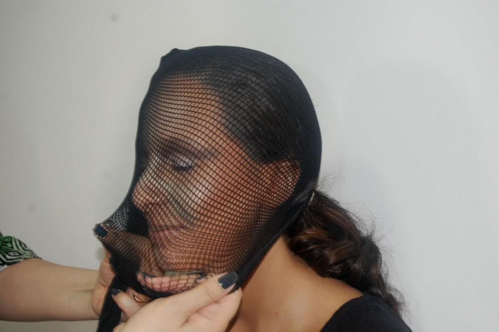 O segredo do efeito de escamas na maquiagem de sereia é usar uma meia arrastão como molde. Cubra todo o seu rosto com a meia. Deixe ela esticada e ajeite os furinhos para que fiquem do mesmo tamanho nos dois lados do rosto.