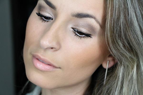 Agora se você está procurando por uma maquiagem neutra mais sofisticada e para um evento de noite ou festa, vou te dar algumas dicas para o conseguir. O truque para uma maquiagem neutra para a noite ou uma festa é o delineado. Comece por aplicar na pálpebra móvel um marrom claro cintilante e, depois passe uma sombra marrom mais escura no canto externo do olho trazendo para o côncavo e esfumando bem como um pincel de esfumar. Depois faça um delineado com um eyeliner preto saindo um ponto da ponta dos olhos e passe também lápis preto rente aos cílios inferiores. Finalize a make de olhos com máscara de cílios ou cílios postiços para um look mais dramático.