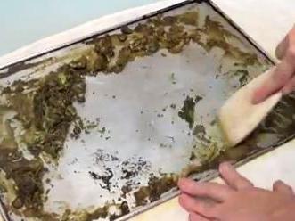 Agora, pegue em uma bandeja de forno, ou qualquer superfície plana e lisa que dê para ir ao forno e espalhe o purê de abacate. Você deve criar uma camada fina, por isso espalhe a pasta o mais que puder. Fazemos isto para facilitar a secagem do abacate e extrair depois seu óleo. Quanto mais fina for a camada, mais rápido secará. Você provavelmente precisará de outra bandeja porque uma não será suficiente para todo o purê.