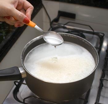 Quando o preparado estiver completamente líquido, retire do fogo e mexa suavemente. Deixe esfriar até que se forme uma camada de nata no topo. Retire a nata e acrescente a essência, o álcool (que irá intensificar o aroma da essência) e os elementos decorativos. É nesta fase que você tem a oportunidade de personalizar seu sabonete. Pode, por exemplo, criar um sabonete esfoliante e hidratante misturando mel e fubá, ou um sabonete de ervas misturando essência de erva doce com folhas de chá secas.