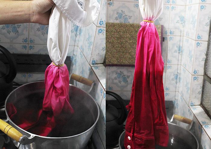 Outra dica é beliscar o tecido em vários pontos e amarrar com barbante. Nesse caso, é possível tingir com corante em pó, que deve ser diluído em uma panela com água. Quando ela ferver, basta colocar a peça de roupa na panela, total ou parcialmente, conforme o efeito desejado.