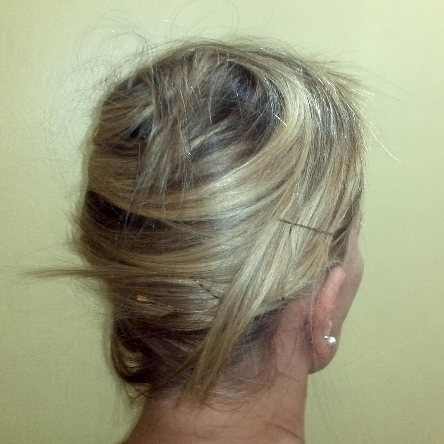 Firme o final da touca com o uso de grampos em toda a sua extensão para firmar os cabelos (isso se preferir utilizar grampos), caso contrário, não use grampos e sim faça uma touca de meia calça apertada e coloque sobre o cabelo penteado.