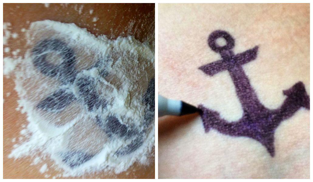 - Coloque talco por cima do desenho e espalhe com o pincel de blush, cobrindo toda a tatuagem. Quanto mais tempo você deixar o talco, mais tempo de vida o desenho terá. Quando estiver bem espalhado, borrife um pouco de curativo em spray por cima de toda a tatuagem. Se você não tem curativo em spray, faça o mesmo procedimento e aplique spray de cabelo no final);