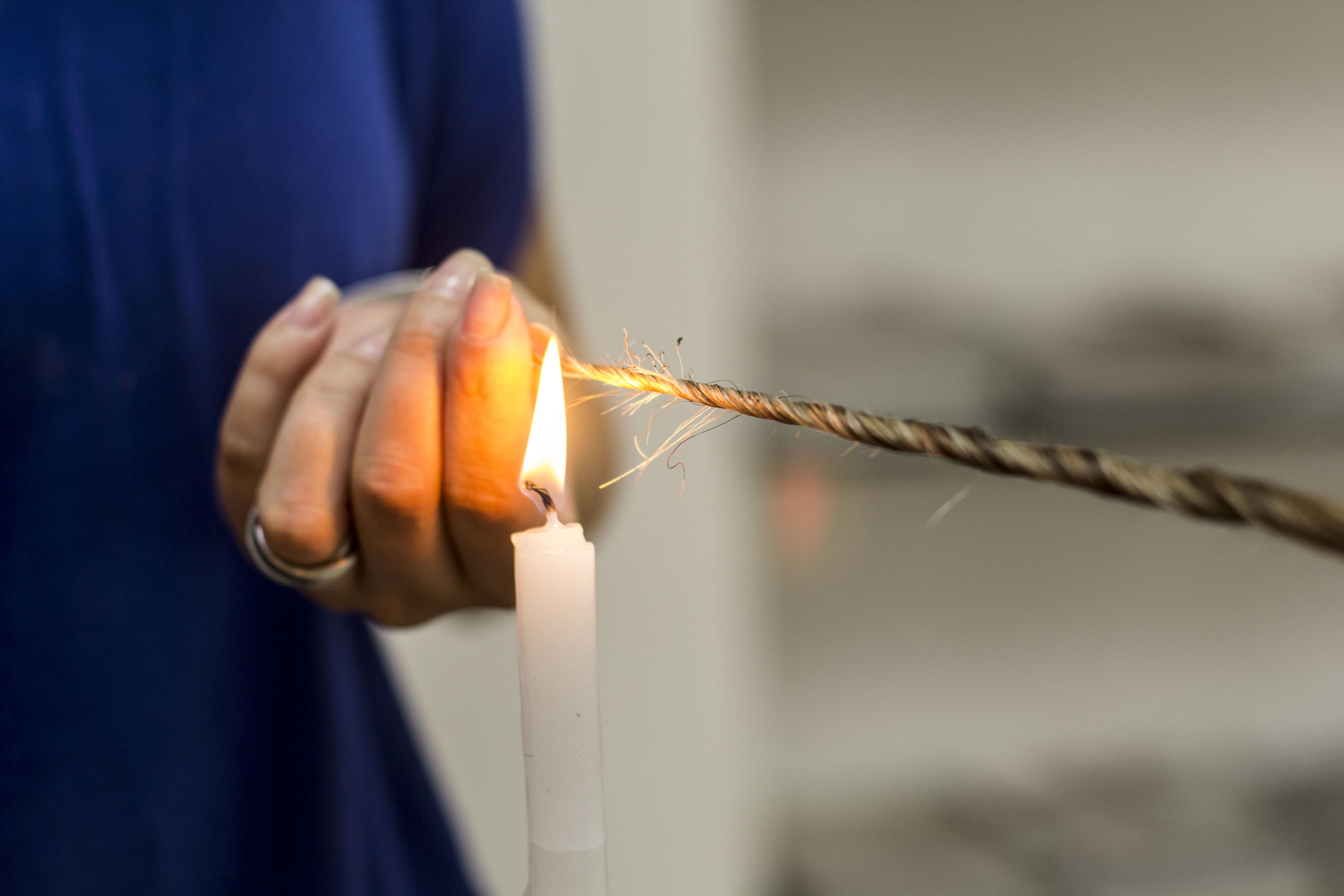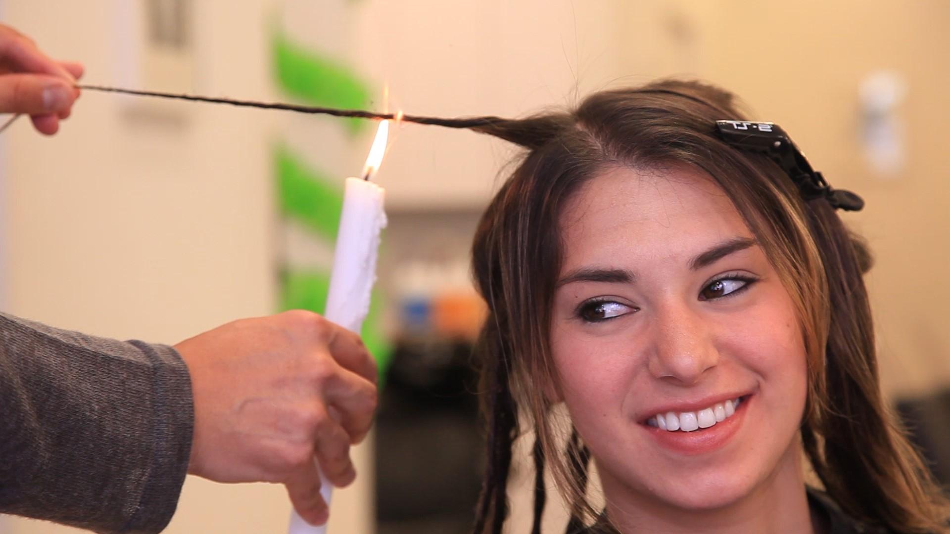 Solte uma das mechas, torcendo-a novamente com firmeza desde a raiz. Desembarace os fios e acenda a vela. Segure a ponta da madeixa e, com uma distância segura para não queimar o cabelo, passe a vela no sentido vertical repetidamente, de modo a queimar as pontas que saem da mecha. Não se esqueça de que é muito importante prestar atenção à distância entre o seu cabelo e a vela para evitar queimaduras e acidentes!