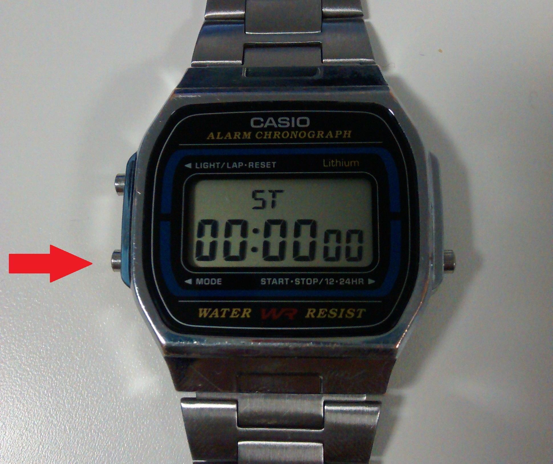 O primeiro passo para mudar a hora ou o dia de seu relógio Casio será pressionar o botão inferior esquerdo, ou seja, o botão MODE. Caso o seu relógio seja de um modelo diferente, é possível encontrar a posição do botão MODE olhando o manual que o acompanha na caixa, caso contrário, pressione o botão indicado pois as chances de ser exatamente esse são grandes.