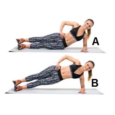 Realize pranchas laterais para eliminar esse culote! Se coloque deitada de lado, com o antebraço esquerdo apoiado no chão, pernas estendidas uma sobre a outra, peito para fora e mão direita na cintura (A). Enquanto contrai o abdômen, eleve o quadril, alinhando-o com o tronco e fique nessa posição durante 1 minuto (B). No final da série, repita com o antebraço direito.