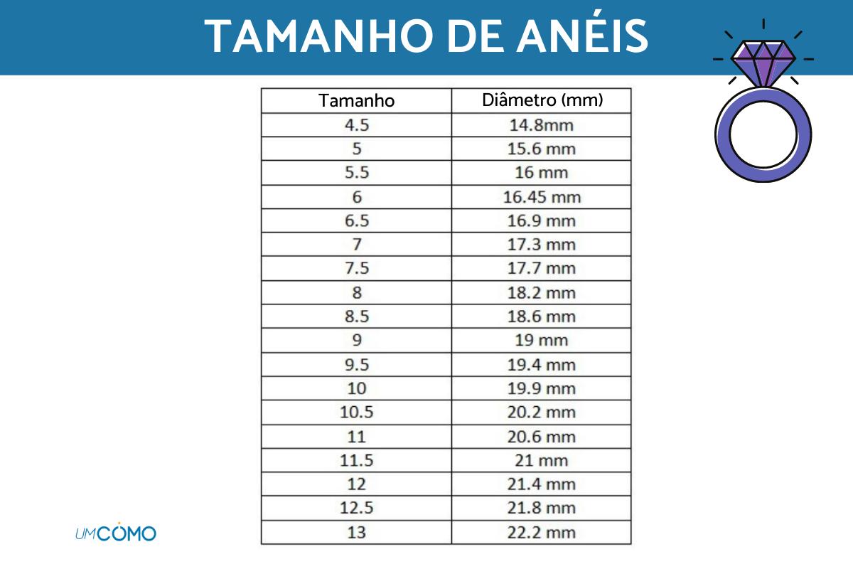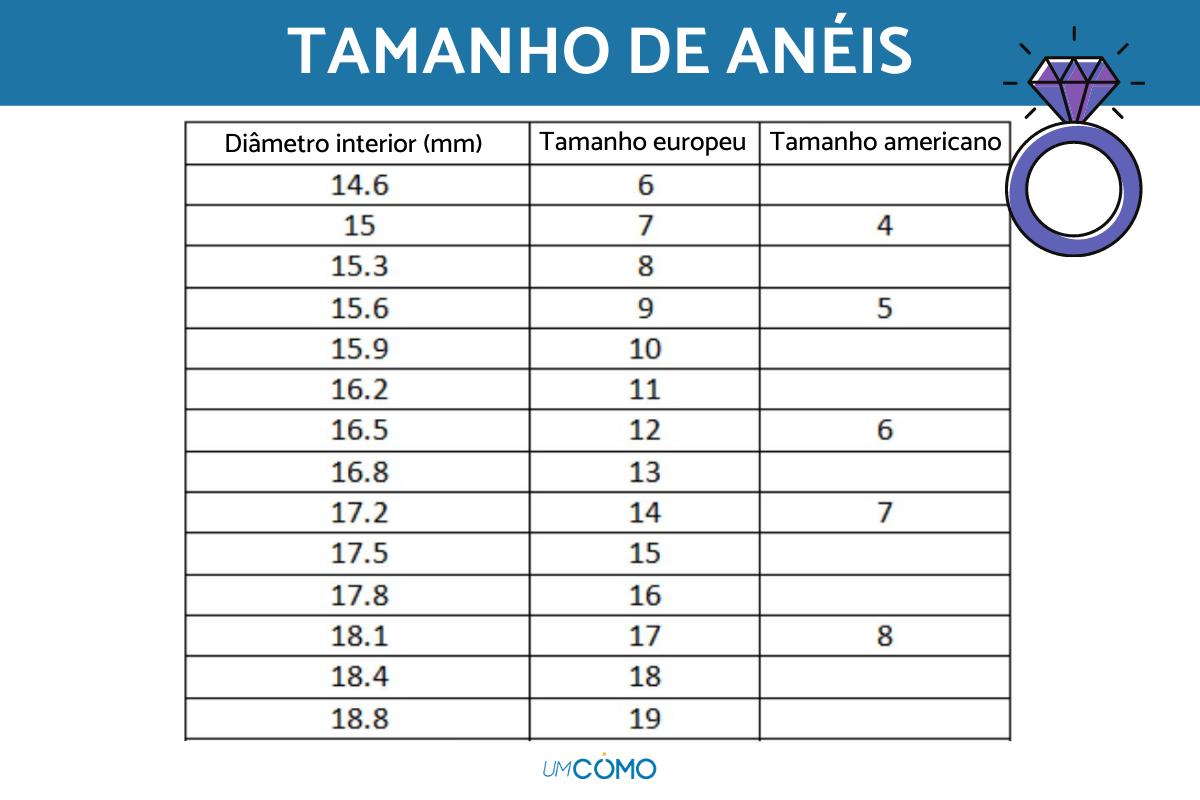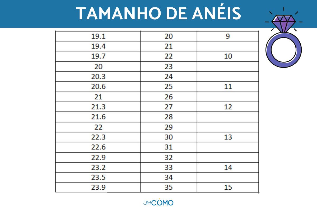 - Consulte seu tamanho nas tabelas das imagens a seguir, onde você poderá observar as equivalências. Os tamanhos estão em mm, não em cm.