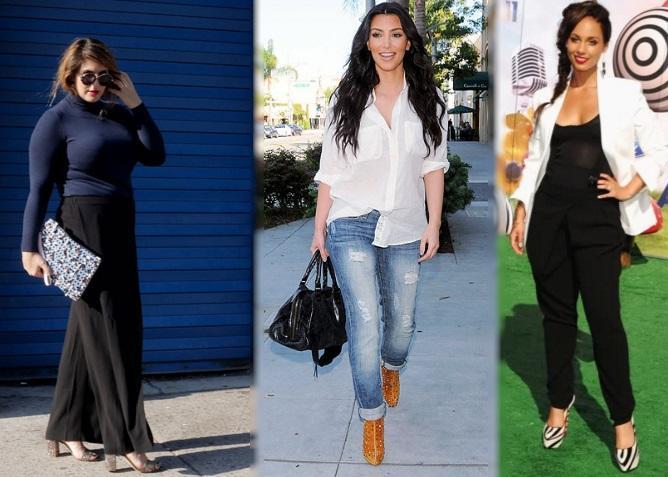As de corte reto são bem mais adequadas que as calças justas ou as boca de sino, além disso, sempre que puder tente que tenham linhas finas verticais que darão um efeito visual mais alongado e fino. Evite os shorts e calças abaixo do joelho, porque diminuem sua silhueta e farão com que você pareça mais larga.