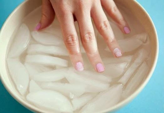 Submergir as unhas em água muito fria também é uma boa opção para o esmalte de unhas secar mais rápido. Pode tornar-se um pouco incômodo e desagradável nos meses de inverno, porém prático no verão. Coloque num pequeno recipiente um pouco de água gelada adicionando também alguns cubos de gelo e mergulhe as suas unhas pintadas durante 20 a 30 segundos. Quando as retirar, deixe que sequem ao ar livre.