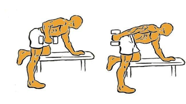 Agora seguiremos com os tríceps, a parte onde costuma acumular a celulite pois é a que costuma conter a maior parte de gordura. Para fazer este exercício também vamos precisar de usar os pesos. Teremos que nos apoiar sobre uma tábua ou de joelhos sobre uma esteira com o corpo flexionado em um ângulo de 90 graus. Apoiaremos um braço no solo para estar firme e com o outro aguentaremos o peso.