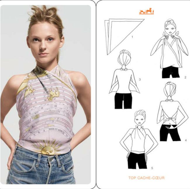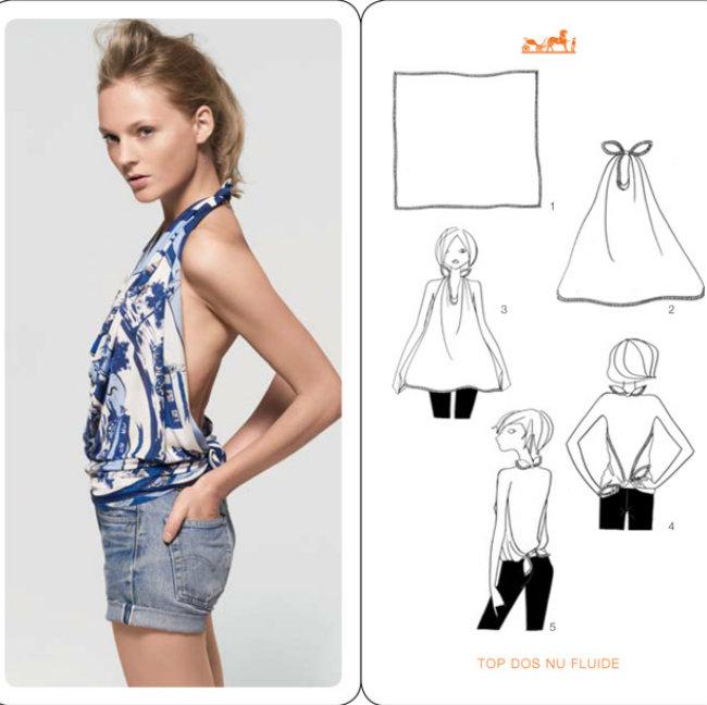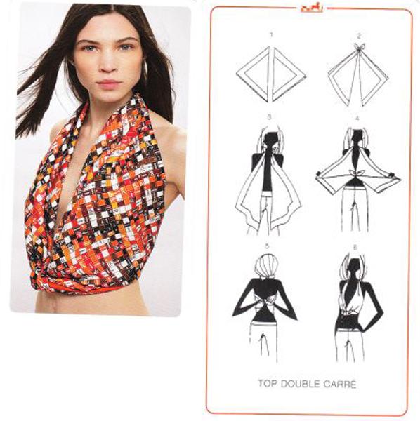 Para transformar os seus lenços em blusas, o melhor é utilizar lenços quadrados grandes. Fazer a blusa da imagem com um lenço é muito simples. Comece por colocar o lenço à sua frente e amarrar duas pontas do quadrado no pescoço. Depois agarre nas outras duas pontas e amarre atrás das costas. Terá uma linda blusa para um dia de calor ou para ir à praia.