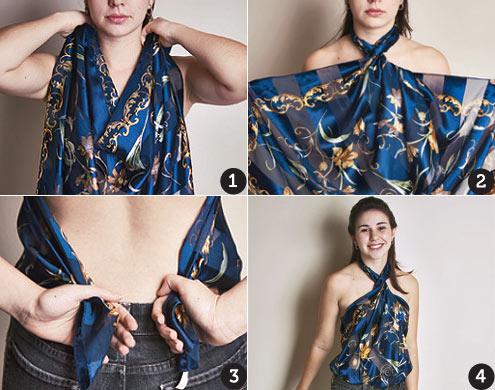 Para conseguir criar a blusa da imagem, você precisará de dois lenços. Comece por dobrar os dois lenços de forma a criar um triângulo e amarre-os por uma das pontas. De seguida, coloque-pelo pescoço e amarre as duas pontas da frente. Agora é só amarrar as outras pontas restantes atrás das costas e já terá uma original blusa.