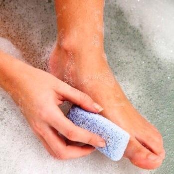 Uma vez que seus pés estejam bem limpos, com a pedra dentro da água e mantendo seus pés ligeiramente ensaboados, passe a pedra-pomes naquelas zonas que tiverem calosidades. Faça-o com movimentos suaves e circulares, incidindo nas partes com calosidades, joanetes, asperezas, fendas, etc.