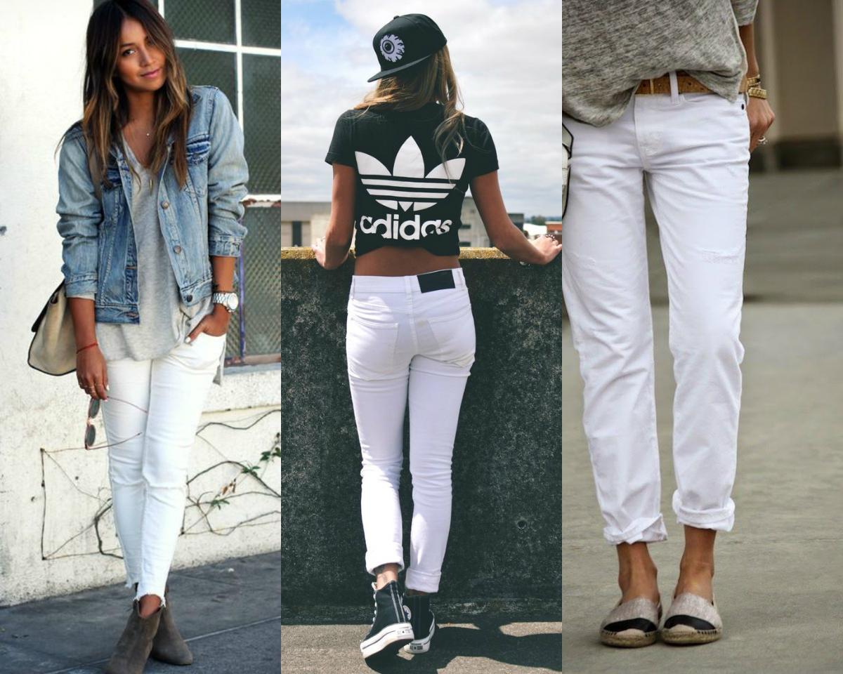 A versão jeans da calça branca é o modelo mais usado hoje em dia. Versátil, a peça segue a mesma premissa do jeans tradicional ao se adaptar em qualquer look e estilo. O jeans branco é moderno, sendo indicado até para customizações como rasgos, tachas e manchas, criando um visual despojado sem deixar a elegância de fora. Essa versão da peça também veste todos os tipos de corpo. Apenas tome cuidado com o comprimento, pois muito curta pode diminuir suas pernas e muito comprida pode gerar acúmulo acima do sapato. Além disso, evite jeans branco muito justo, que marcará as imperfeições do corpo.